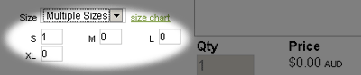 You may have created a design and would like to apply it to more than one size of selected product. That's fine. From the Size dropdown, select 'multiple sizes'. Quantity boxes display all available sizes for that product.